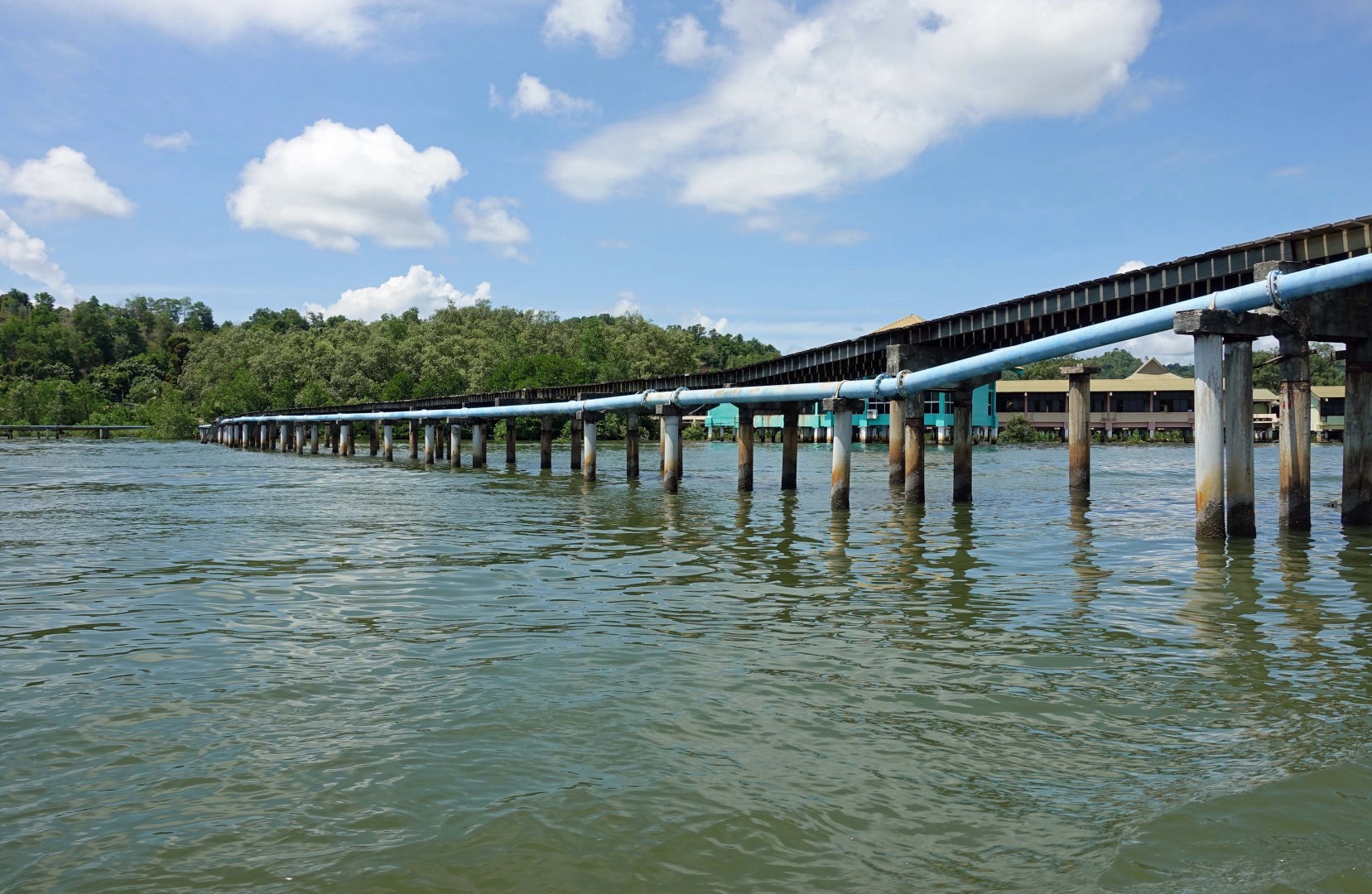 船は再びモスクの脇を通り抜け、水上集落に入りました。立派な水道管が引かれています。