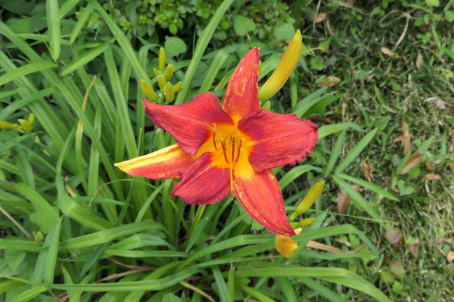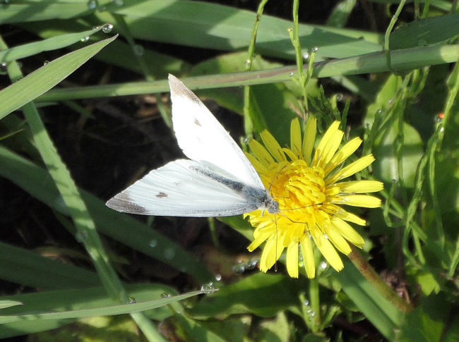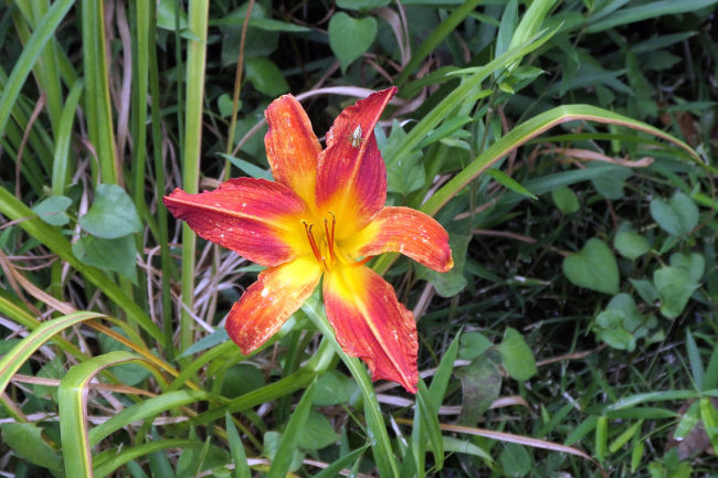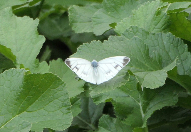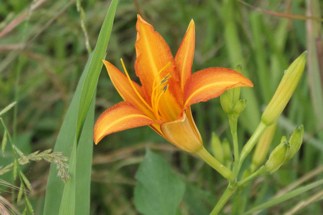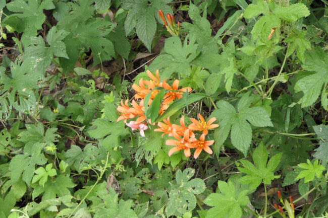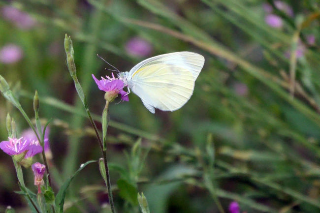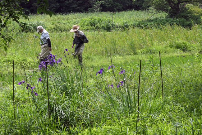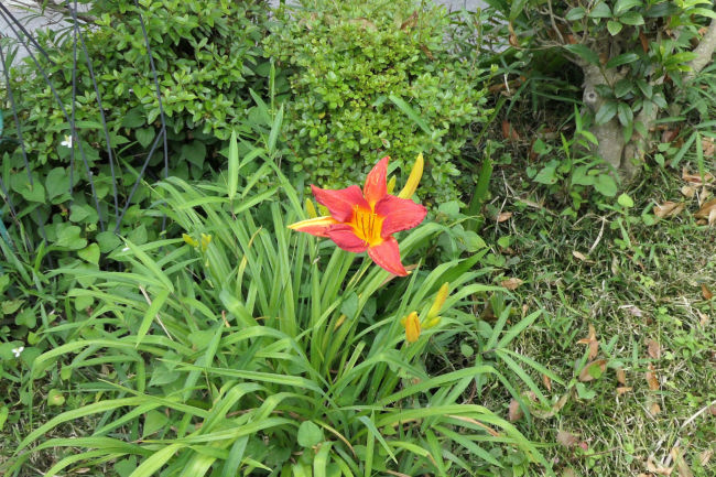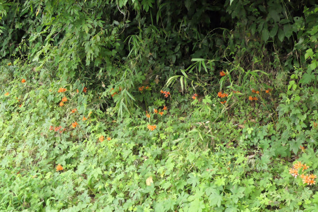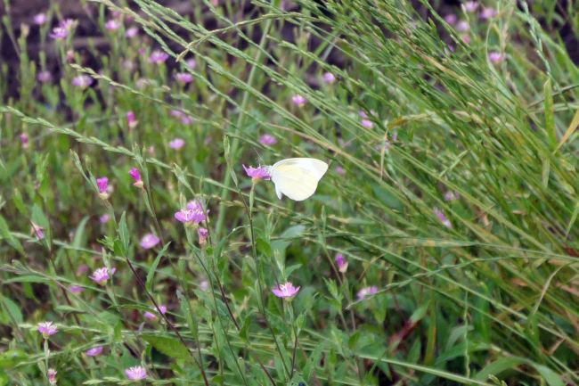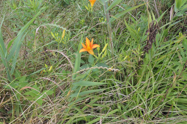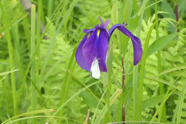 近くにきれいなキスゲの花を見つけました。あやめに蝶がとまっていました。