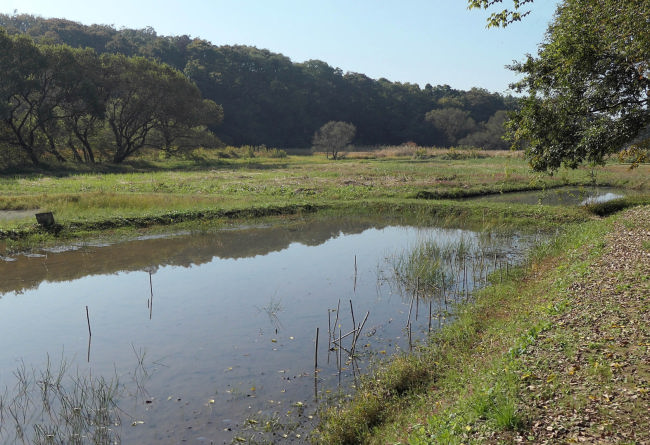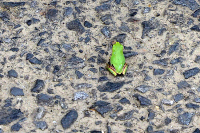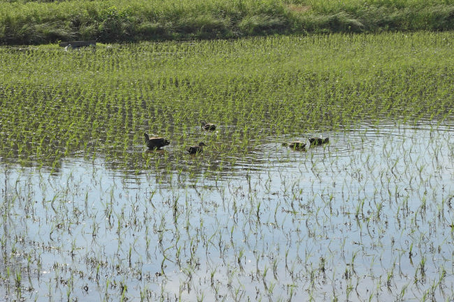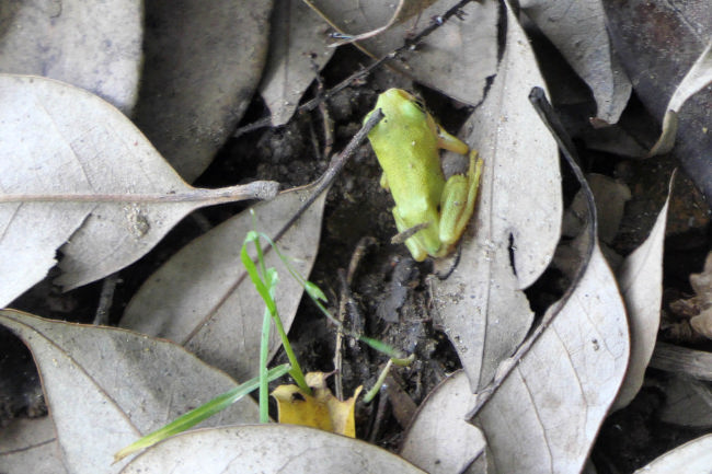 田んぼでオタマジャクシとして育ったカエルは足が発達すると陸に上がり、その一生を木の上で過ごすそうです。お腹の卵が育ってくると田んぼに戻り卵を産み付けます。