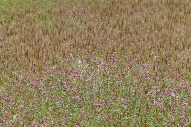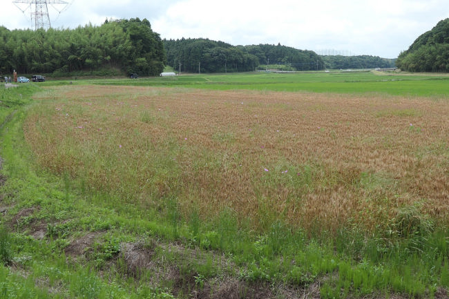 この土地の人でしょうか、道路を塞ぐように成長した雑草を刈り除いていました。麦が収穫時期を迎えています。