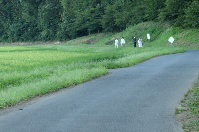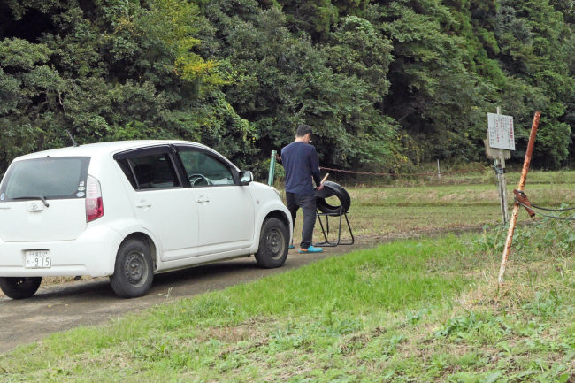 田んぼの道の脇でドラムの代わりにタイヤをたたいて練習している人がいました。うるさく無くて良いかもしれません。