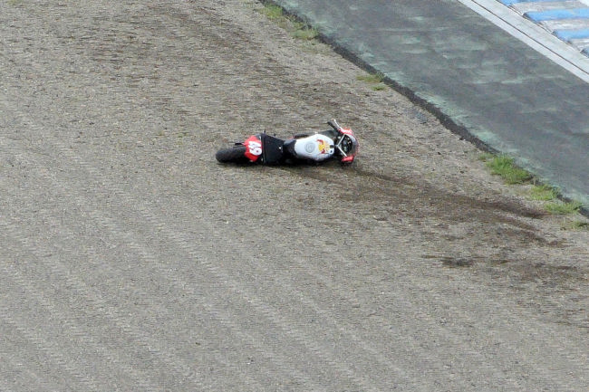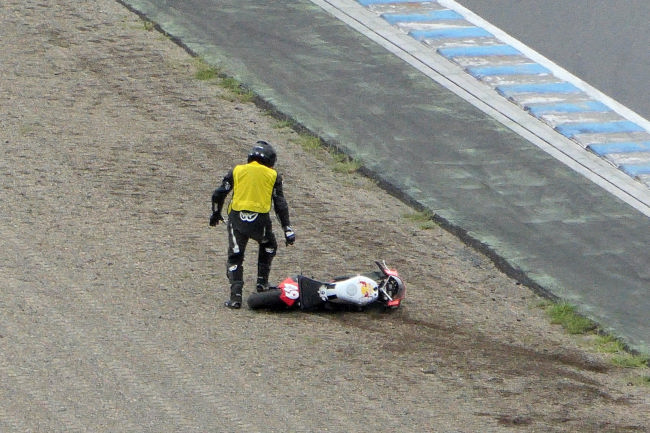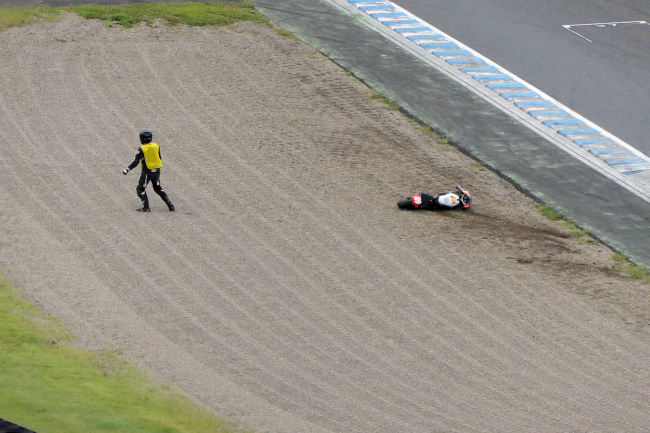 見ていたところオートバイを運転中のドライバーが転倒し、放りだされました。本人は驚いて周囲の人の助けを求めていたようですが誰もいません。仕方なく、少し休んだ後、再びオートバイに乗り練習を始めました。 |