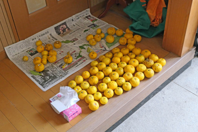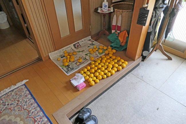 取ってきたゆずを玄関に並べて、近所にあげたり、お風呂に入れたりして楽しみました。