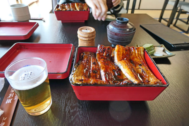 帰りはいつも利用するうなぎ屋で昼食です。ここも畳床の上にテーブルと椅子が置かれていました。つい最近直したようです。 |