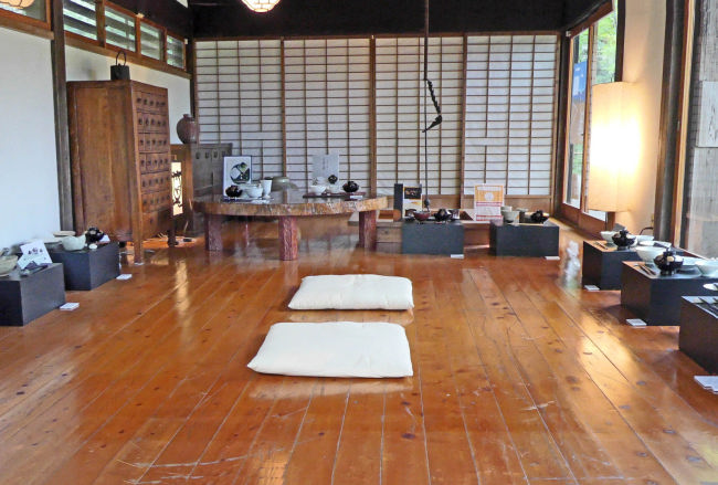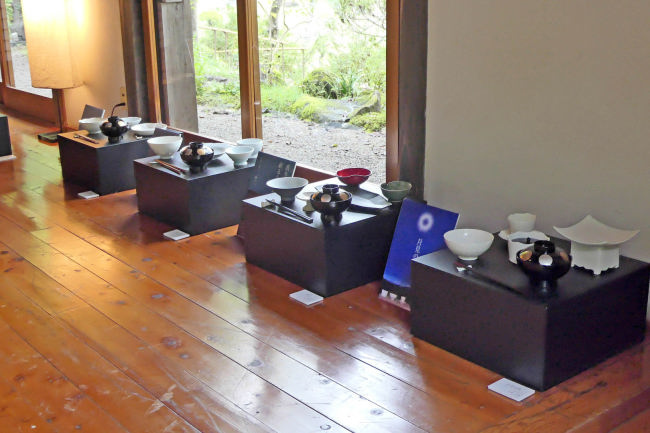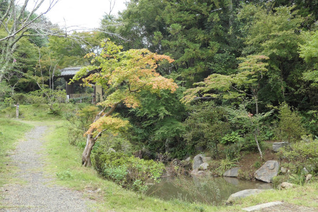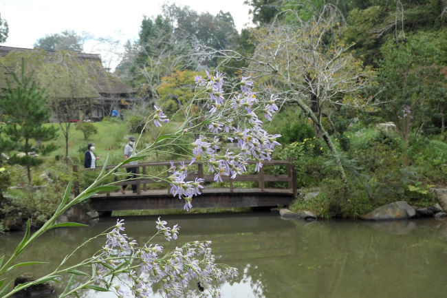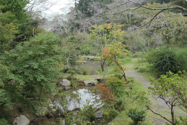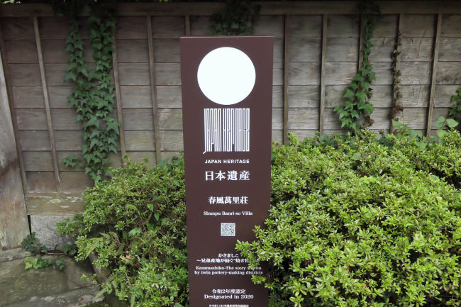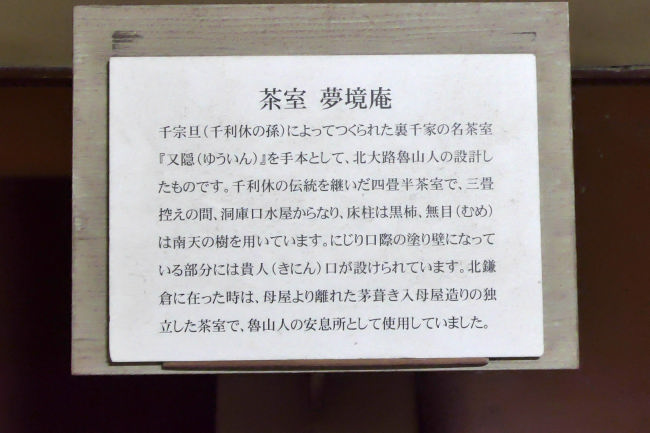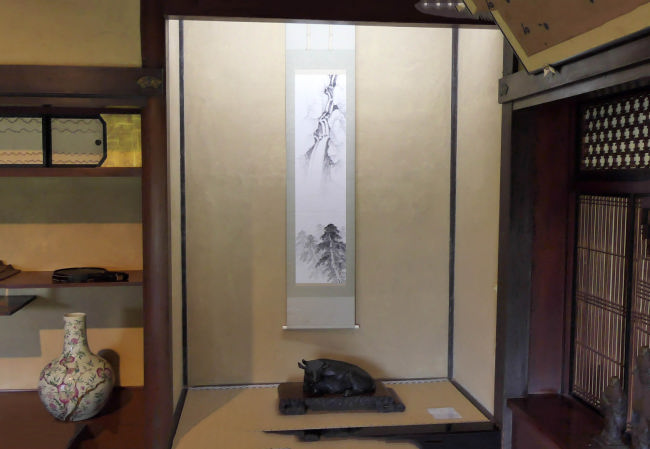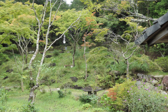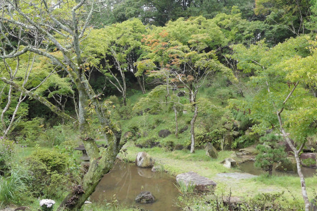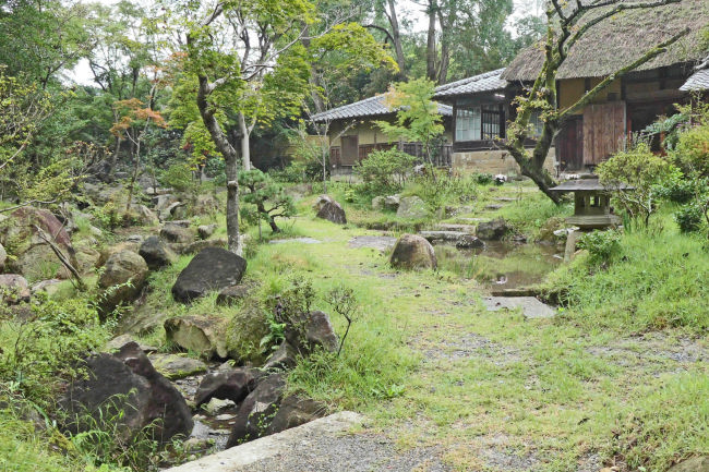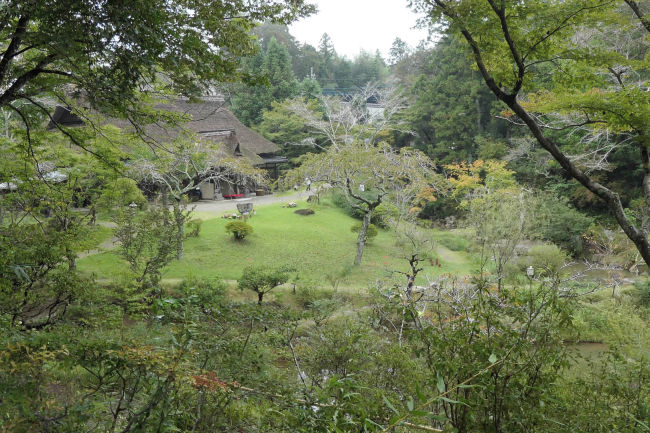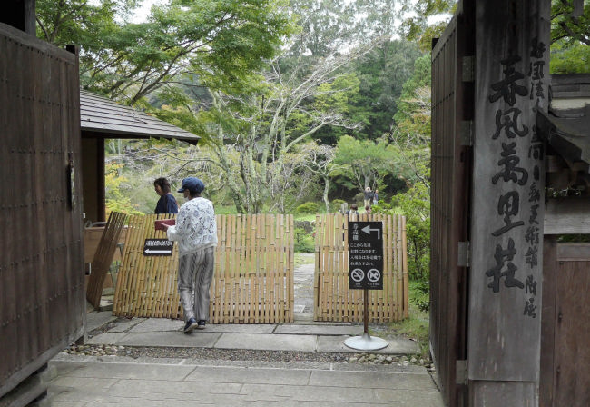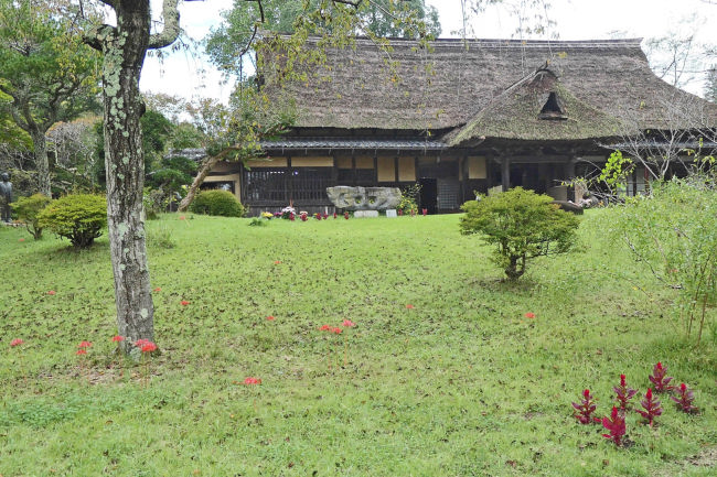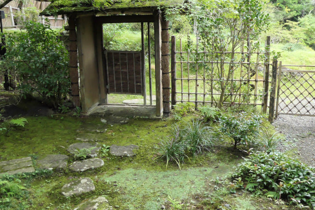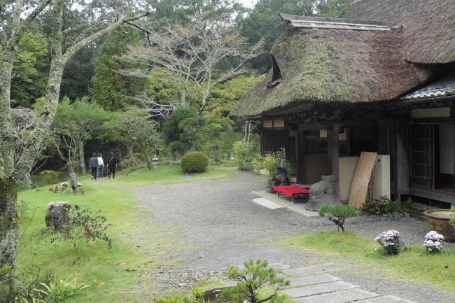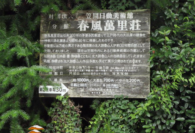 「春風萬里荘」(しゅんぷうばんりそう)はかつて北大路魯山人が自らの居宅としてた古民家で、1965年(昭和40年)に笠間日動美術館の分館として北鎌倉からこの地へ移築されました。この茅葺の母屋の前には地形を活かした回遊式庭園、母屋裏に京都『龍安寺』の石庭を模したという枯山水庭園があります。お庭を眺めながらお茶を頂きました。 |