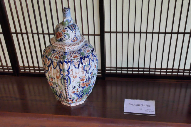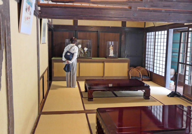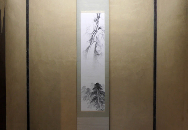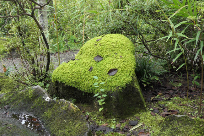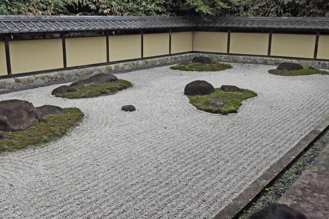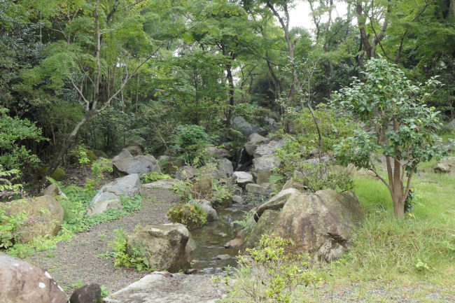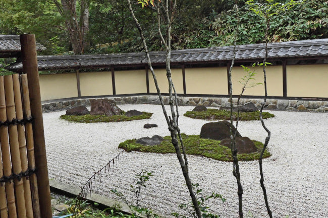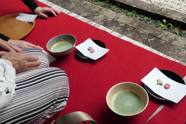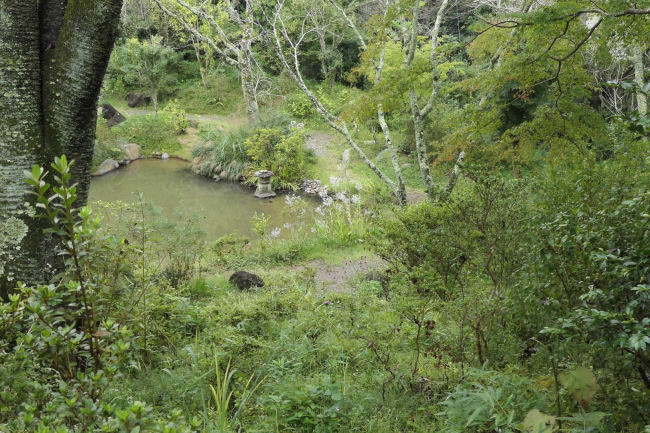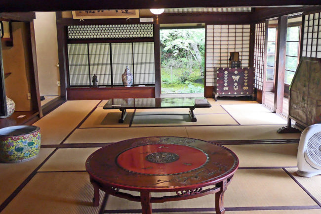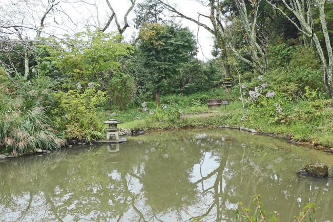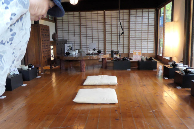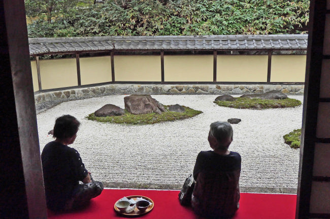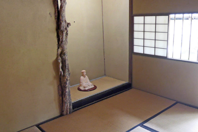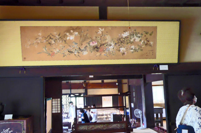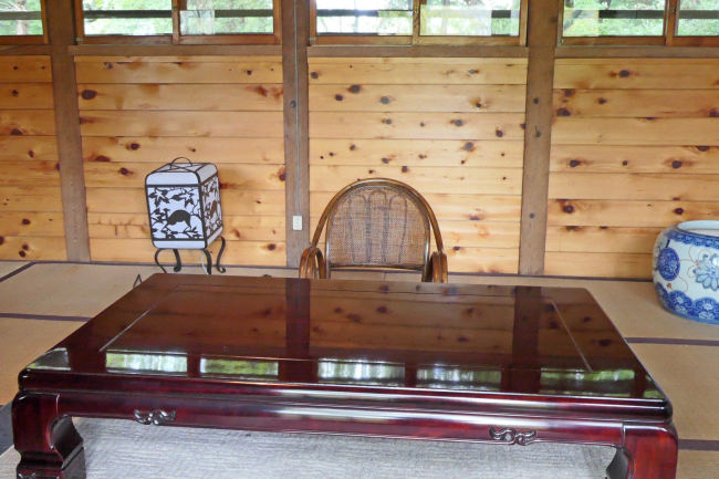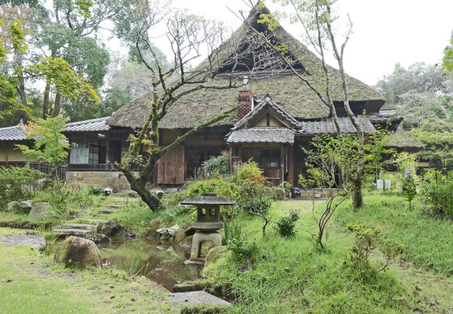 「春風萬里荘」(しゅんぷうばんりそう)はかつて北大路魯山人が自らの居宅としてた古民家で、1965年(昭和40年)に笠間日動美術館の分館として北鎌倉からこの地へ移築されました。この茅葺の母屋の前には地形を活かした回遊式庭園、母屋裏に京都『龍安寺』の石庭を模したという枯山水庭園があります。お庭を眺めながらお茶を頂きました。 |