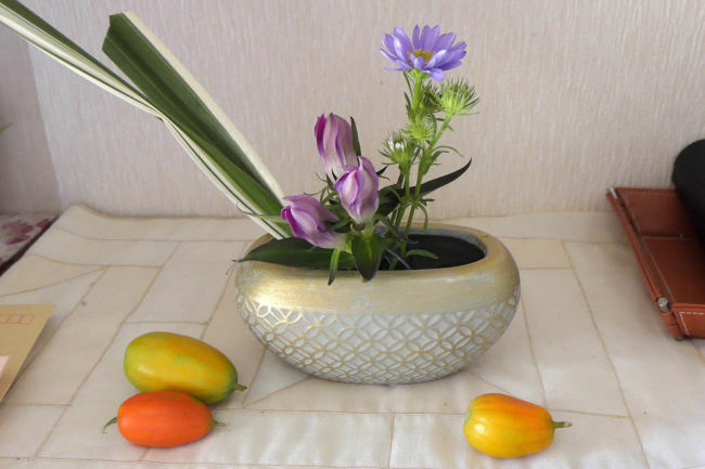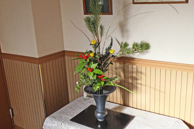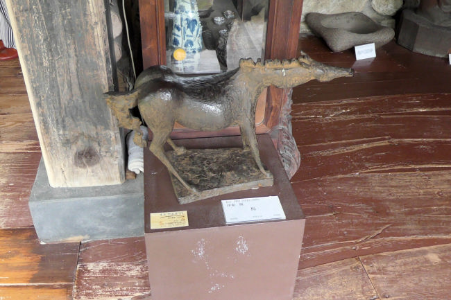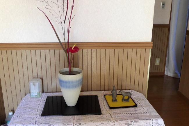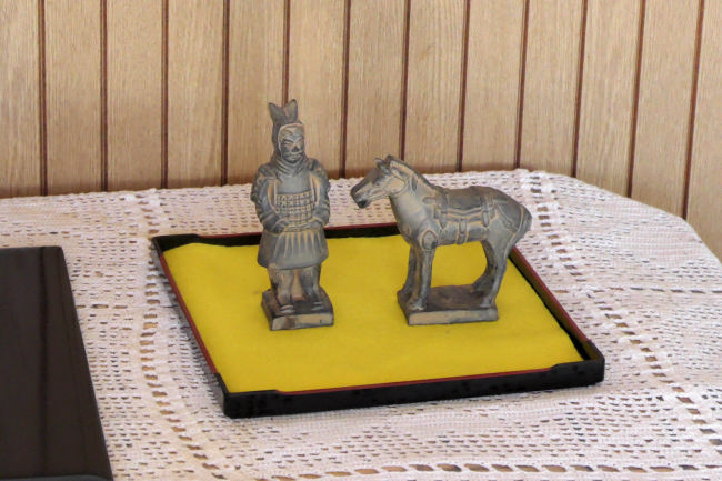 玄関のお花です。中国の始皇帝陵と兵馬俑抗に行ったとき買ったお土産が飾られています。