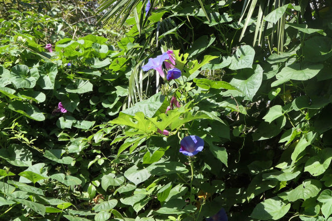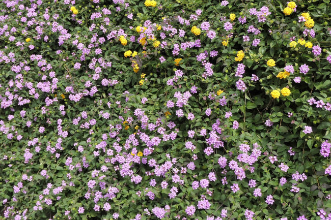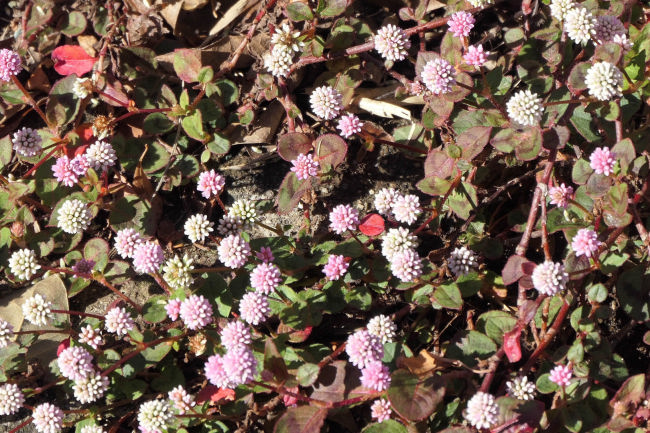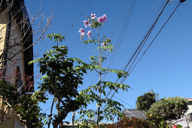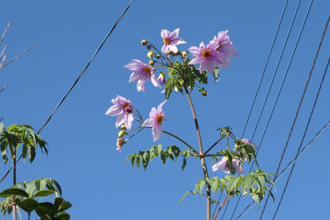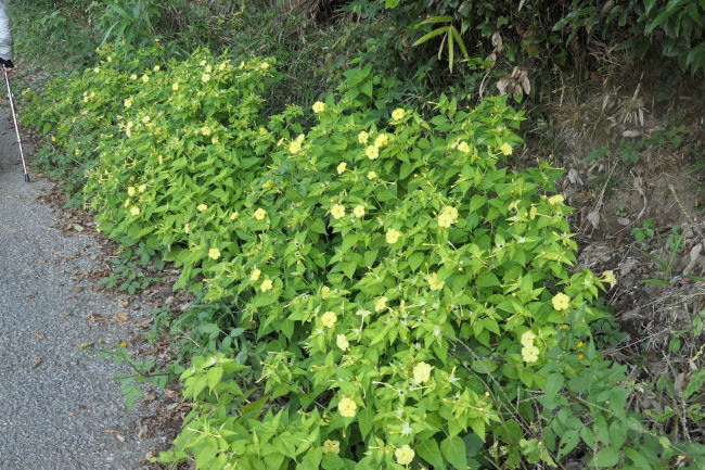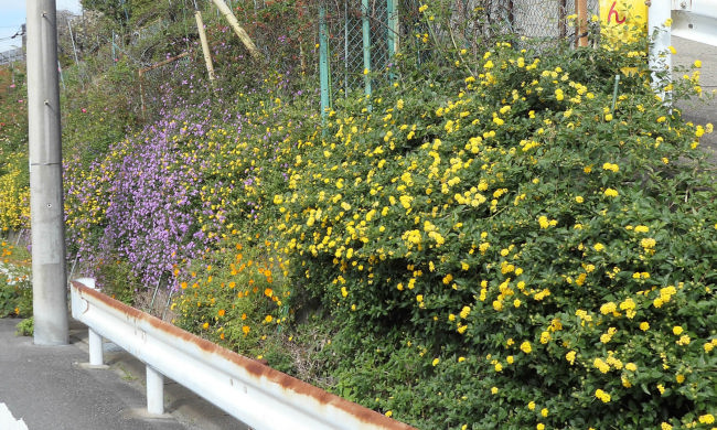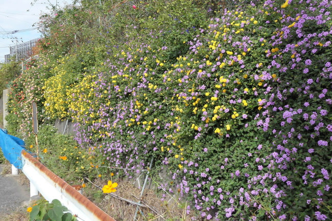 自宅から志津駅へ。 散歩のため寄り道を通るとたくさんの花が咲いていました。公共の道路壁で自然に生えたのでしょうか。 |