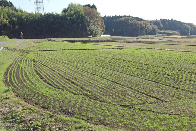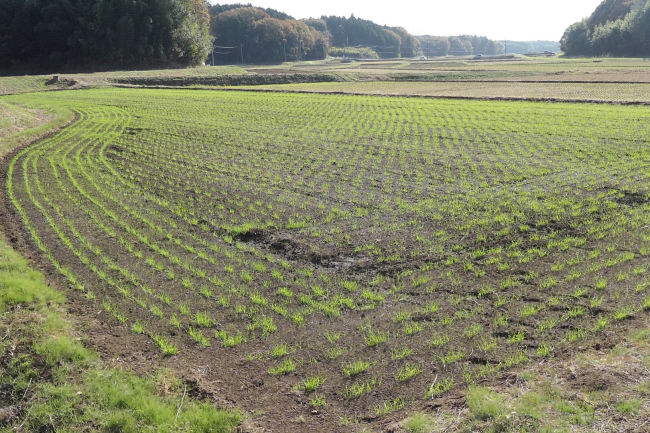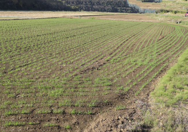 麦がきれいに芽を出しました。これらの麦は牛などの資料に使用されるようですが、種をまくと1週間ほどで発芽し、冬はゆっくりと成長します。 |