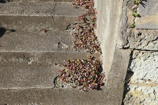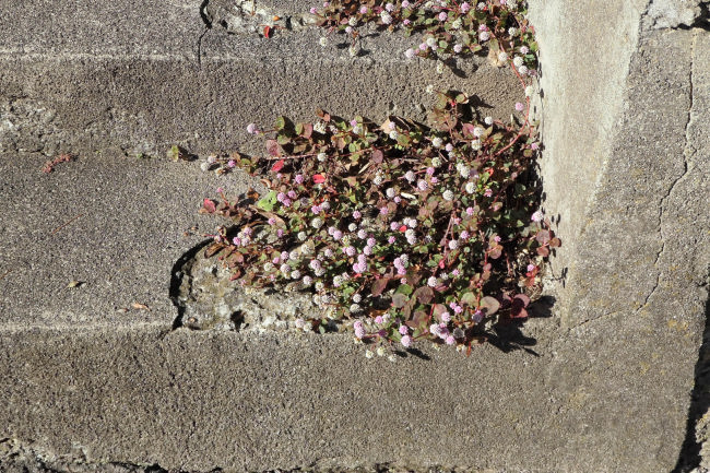 50年以上も前に購入したままにしてかなり傷んできた入り口の階段ですが、その隅には小さな雑草が花を咲かせていました。接近して写真にとるとかなり奇麗でした。 |