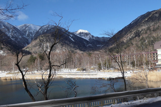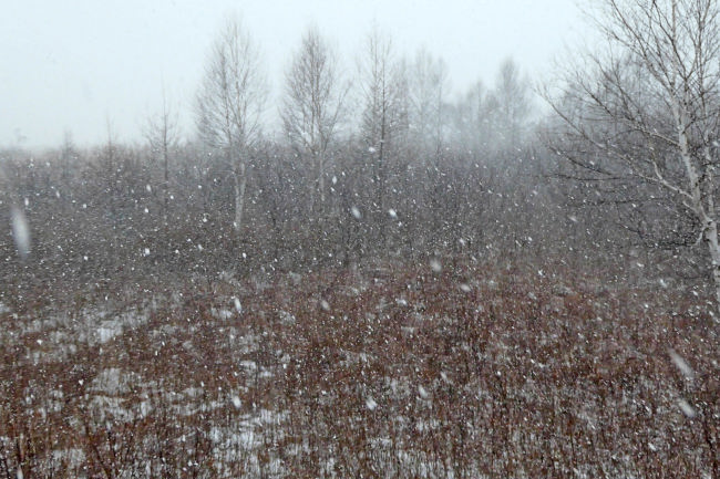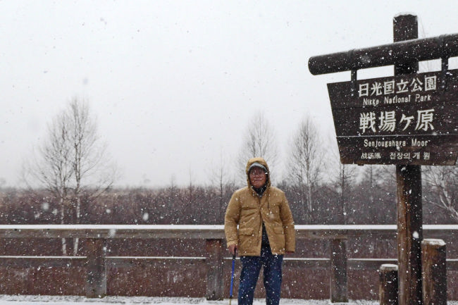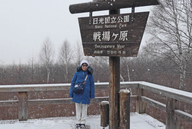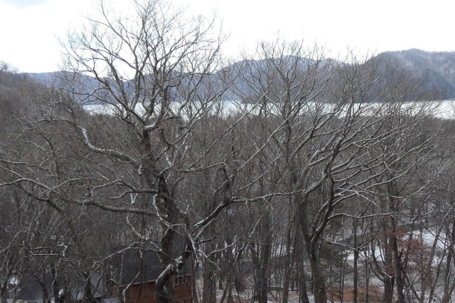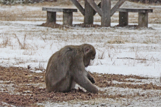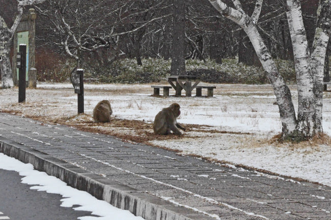 中禅寺湖からさらに上ると戦場ヶ原に到着です。夏、日光の商店街はたくさんの野生の猿に悩まされますが、この寒い中、二匹の猿がものすごい速さで手を動かし、何かを食べているようです。 |