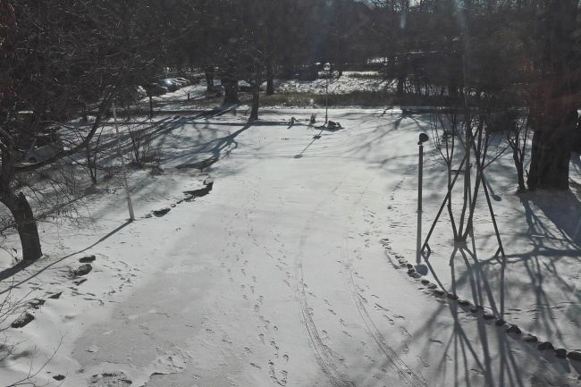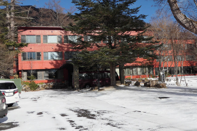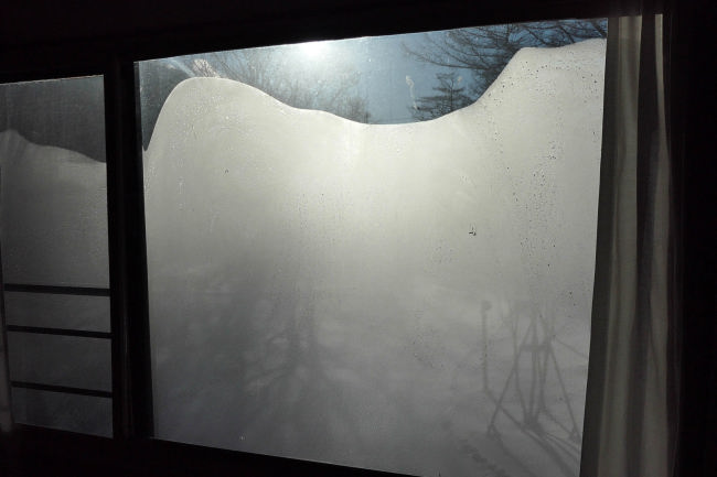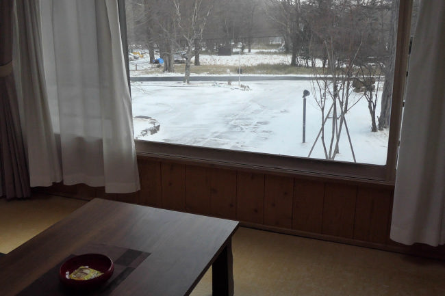 朝の窓ガラスはまだ雪が残っていました。泊まったホテルの外壁は赤く塗られていました。