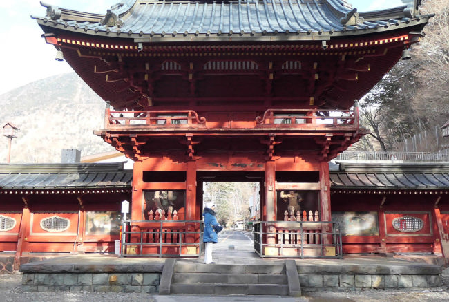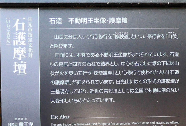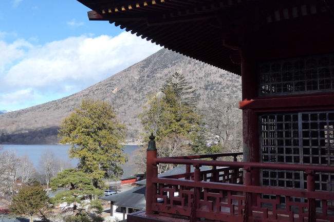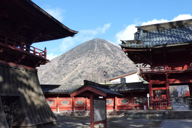 この五大堂はかなり階段を登った高台にあります。 お堂の中はキラキラと輝くたくさんの飾り物があります。写真禁止は残念でした。男体山の標高は 2,486mですが、ここから見える頂上は8合目ぐらいでしょうか。 |