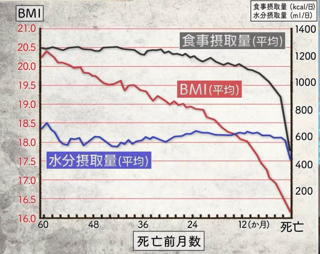 死ぬ5年ぐらい前から、通常通りの食事や水分を取っているにもかかわらず、ゆっくりと時間をかけて体重が減っていくそうです。