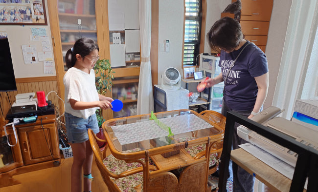 娘と孫が我が家で卓球をしています。おもちゃ屋で卓球道具を買ってきたようです。 |