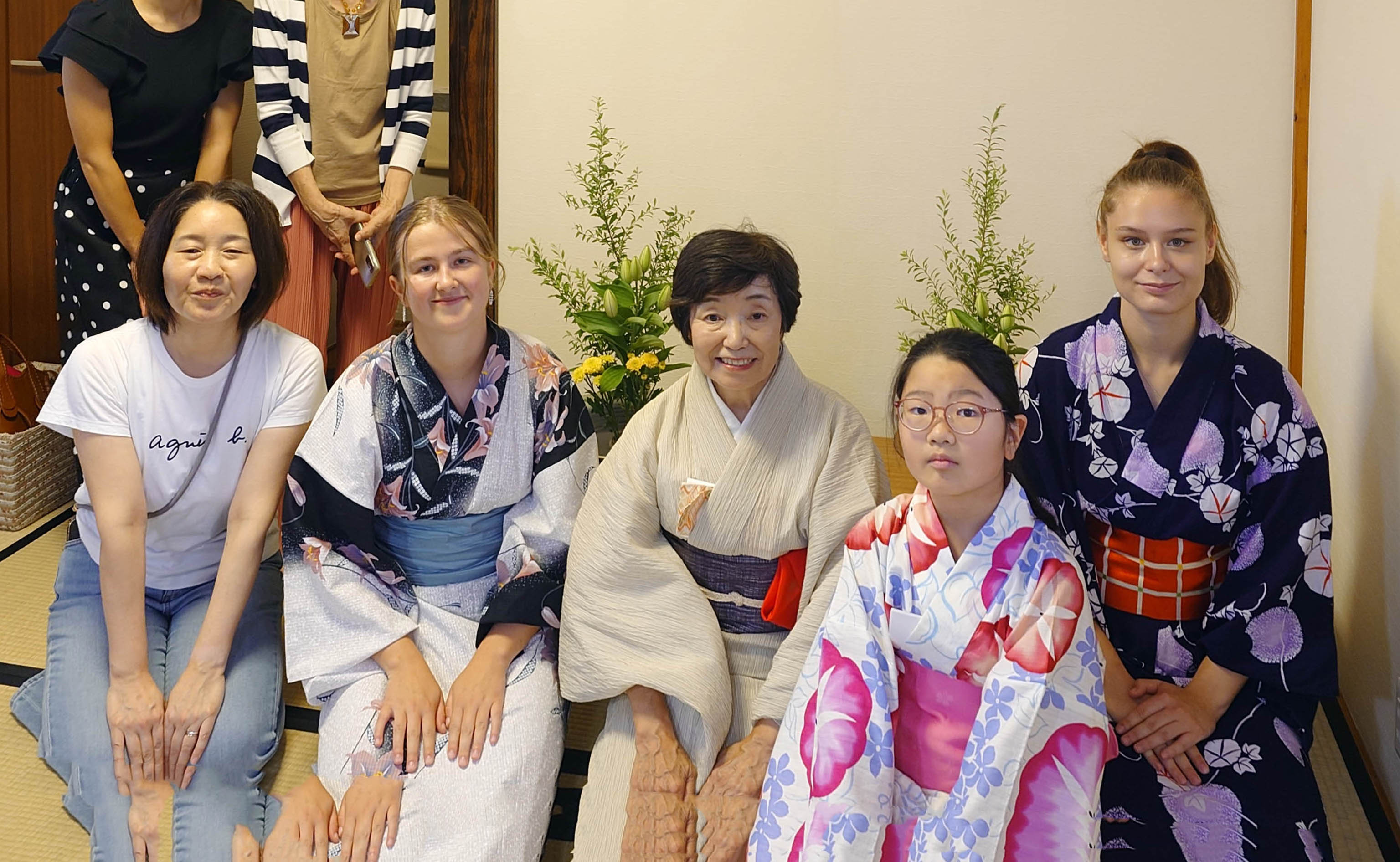 8月初旬 国際間の交流の目的で夏休みの間、外国の人が日本の大学で学びますが、ボランティアさんの家で寝泊りしています。そこの奥さんが日本文化を紹介するため、我が家に連れて来て、家内が半日ほどお花とお茶の話をして過ごしました。この写真は外国からの学生と娘と孫も混じっています。 |