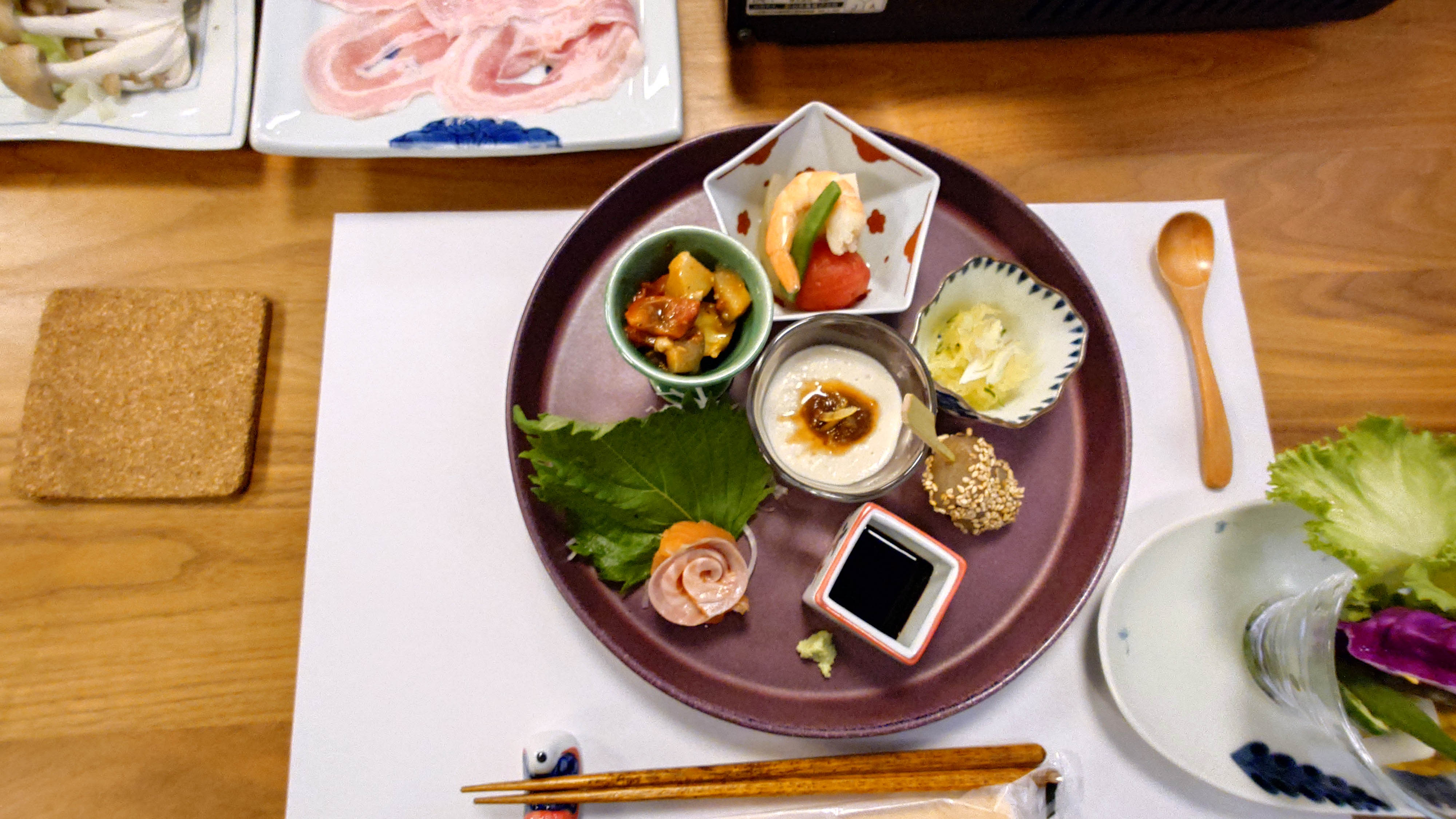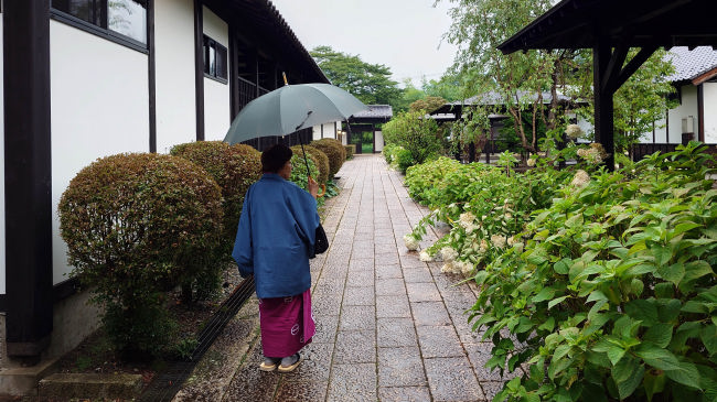 昨夜の台風でたくさんの花が倒されていました。朝食は昨夜と少し離れたところで個室でした。 |