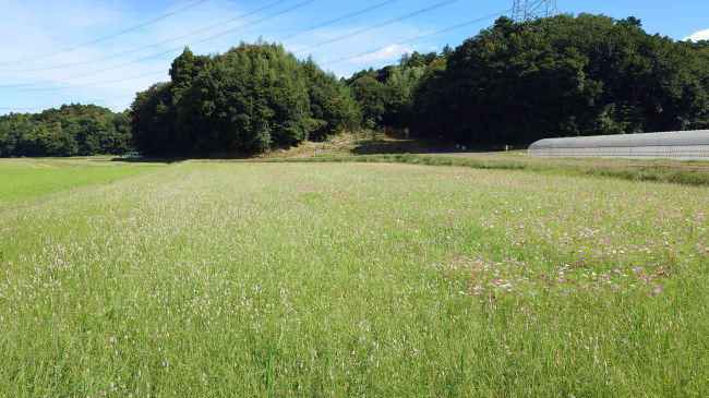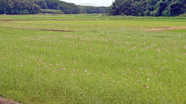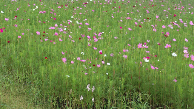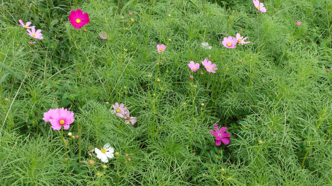 コスモスが花を開きだしました。今年は例年よりも花が少ないようです。ここに花を見に来る人はほとんどいないので、種をあまりまかなかったのかも知れません。 |