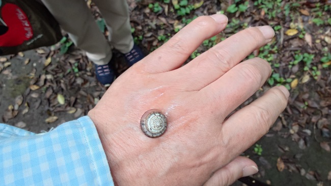 庭の葉にカタツムリがいたので手に取ってみました。なかなか首を出してくれません。(でんでん虫々かたつむり、おまえの頭はどこにある。ツノだせヤリだせ頭だせ) |